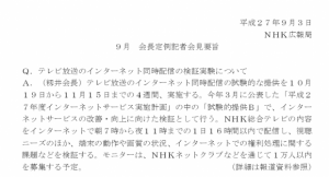 NHKは9月3日、テレビ放送をインターネットで同時配信する実験を、10月19日から11月15日まで行うつもりであることを発表しました。
