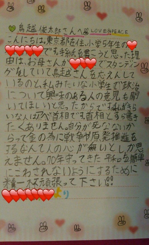 『こんにちは。東京都在住、小学5年生の◯◯です。私みたいな小学生で政治に興味のある人の意見を聞いてもらいたいと思ったからです。』http://pbs.twimg.com/media/CoiisMSVIAUVERX.jpg