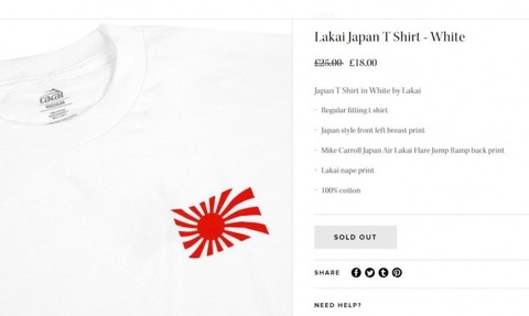 ラカイジャパンが販売しているTシャツに戦犯旗が描かれている。ホームページキャプチャ米国の靴兼衣料品製造会社「ラカイ」が戦犯旗が描かれたTシャツを販売して論議がおきている。