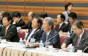 韓国が「日韓スワップ復活」を求めた日韓経済団体の会合。右から2人目は経団連の榊原定征会長=26日、東京都内